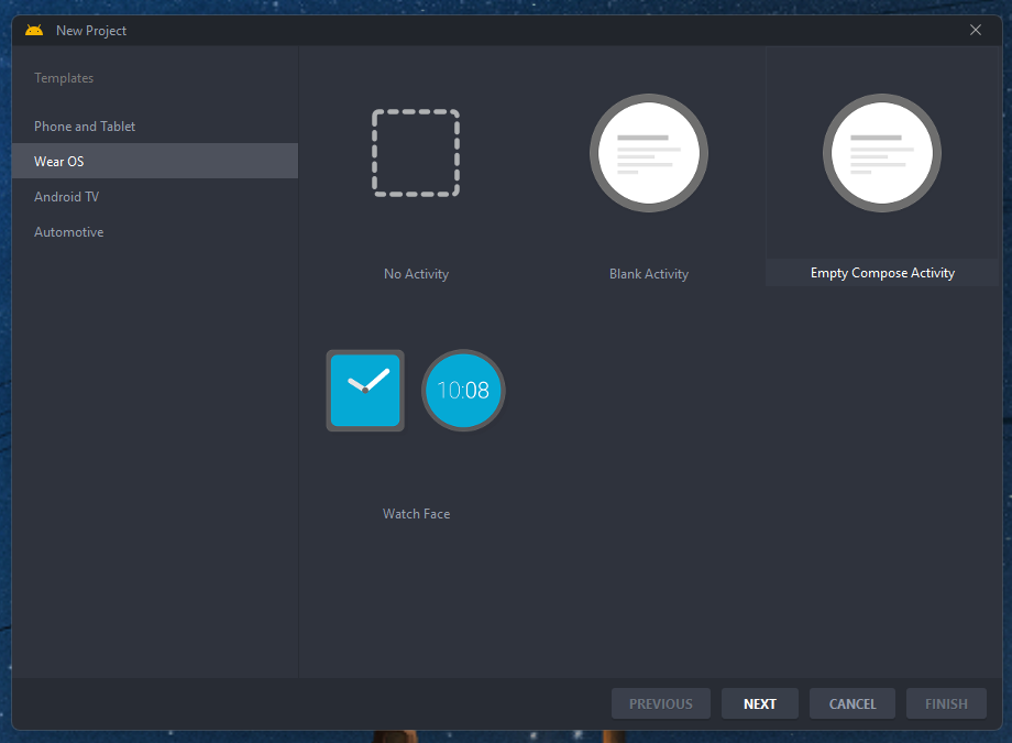 Com Android Studio aberto, crie um novo projeto. Na lista de templates, selecione "Wear OS >> Empty Compose Activity" e continue.