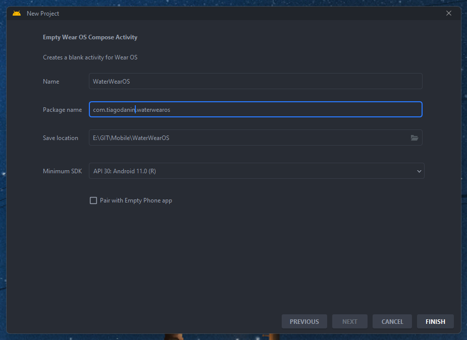 Configure o app com nome, ID, localização do projeto e versão mínima do Android Wear OS (API Level 30 para este exemplo).