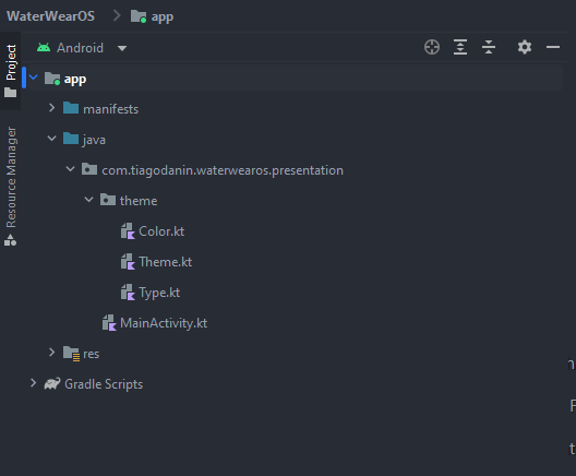 WaterWearOSTheme { UI }- aplica tema aos elementos internosScaffold(Props) { UI }- estrutura base de layoutTimeText()- relógio padrão no topo