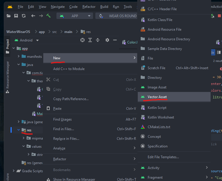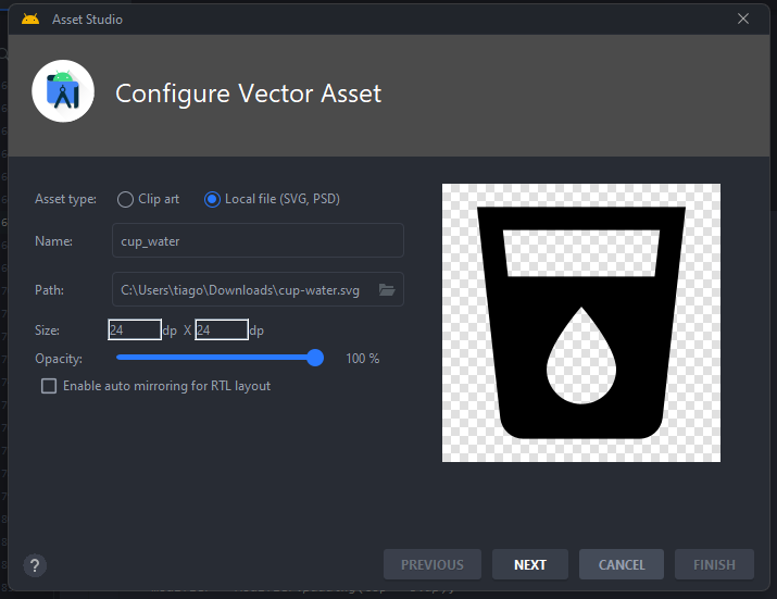 Para importar ícones customizados, baixe SVGs do Material Design Icons Community e use "New > Vector Asset" na pasta res.